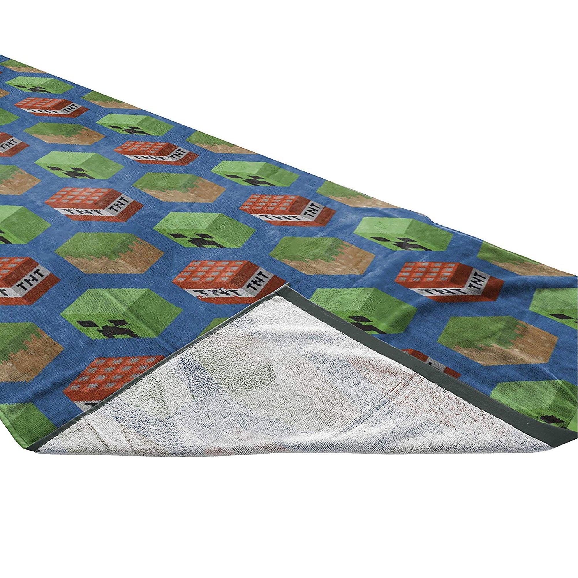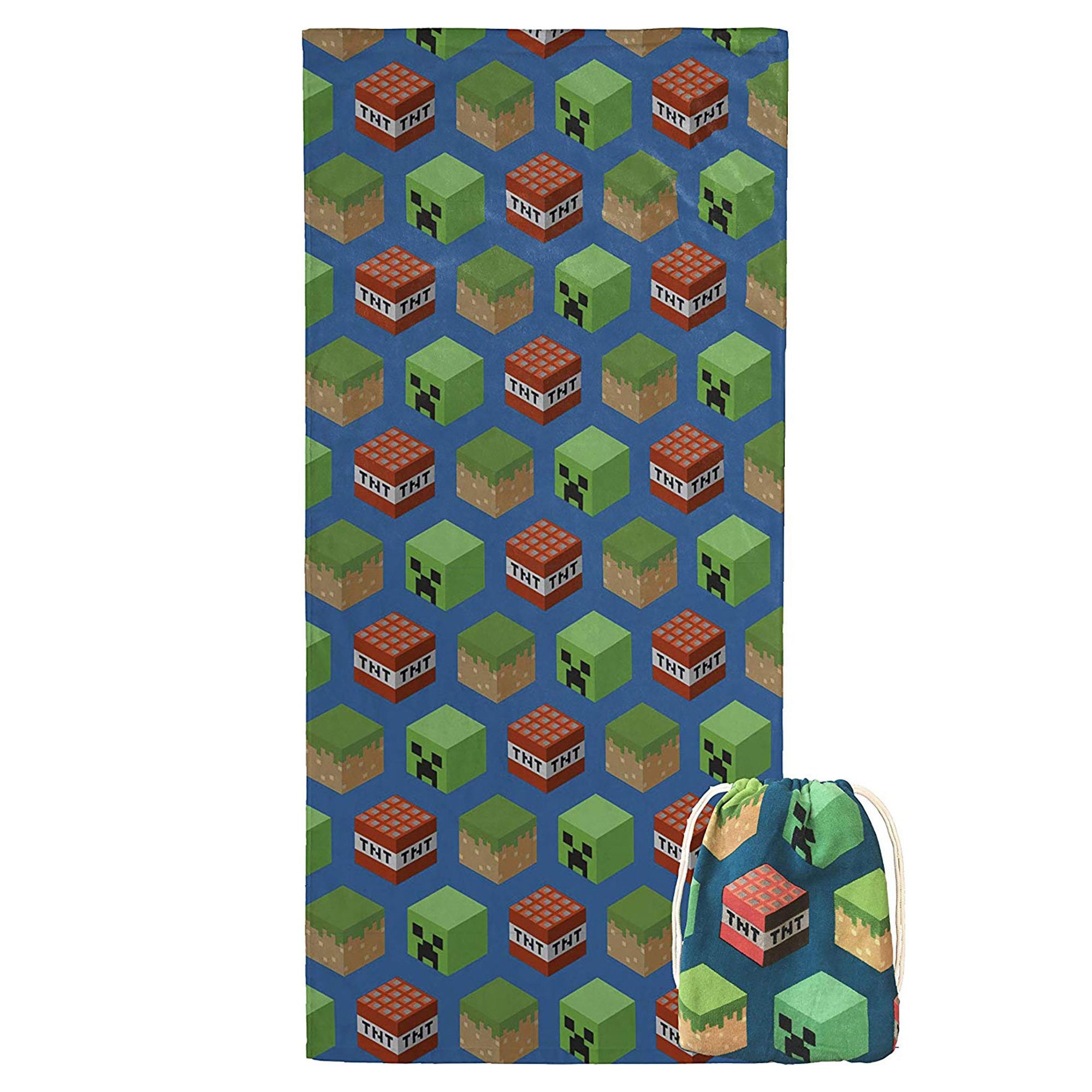 Bring home your favorite characters with this Minecraft towel and connected drawstring bag. Great for the bath, pool, or beach! Your child will love drying off in this beautifully designed towel featuring the iconic Creeper with TNT and Grass Blocks. Breathable fabric allows for absorbency while also being comfortable to touch.