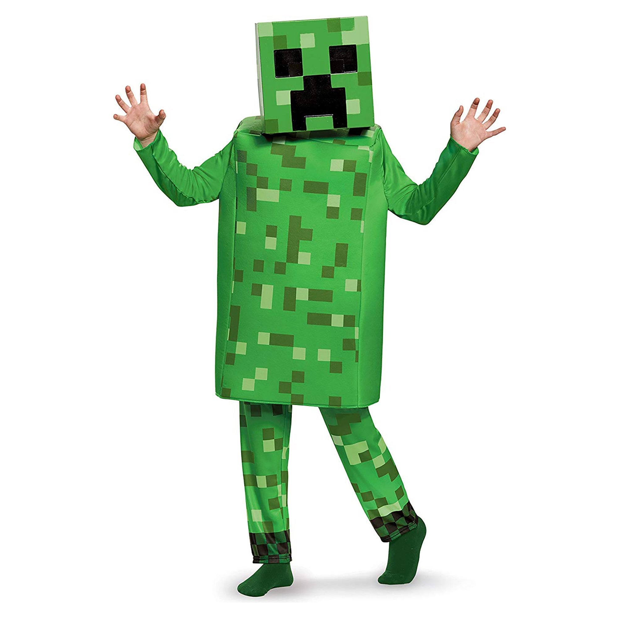 Dress up as a character from Minecraft with this Creeper costume. Set includes 3D constructed top, pant legs and plastic mask. The vacuform half mask includes a mesh eye-plate and foam insert to allow comfort and outstanding range of vision.