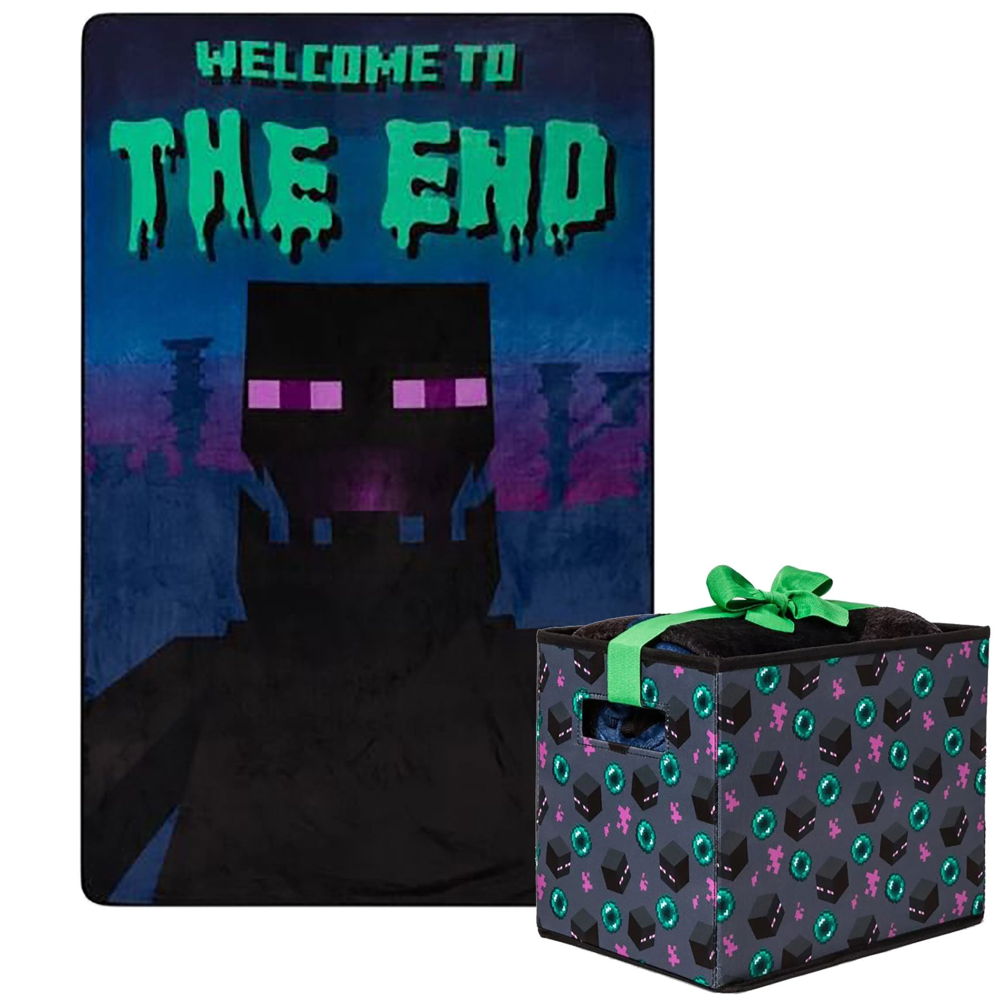 Everything Enderman! This two-piece set includes both a blanket plus a storage box. The super comfortable blanket measures 60 x 90 inches and features an Enderman welcoming you to The End. Use the matching box to store the blanket, and use it as a place to keep all your Minecraft toys! The storage box measures 12 x 9.75 x 8.75 inches and features a repeating pattern of an Enderman head and Ender Pearls.