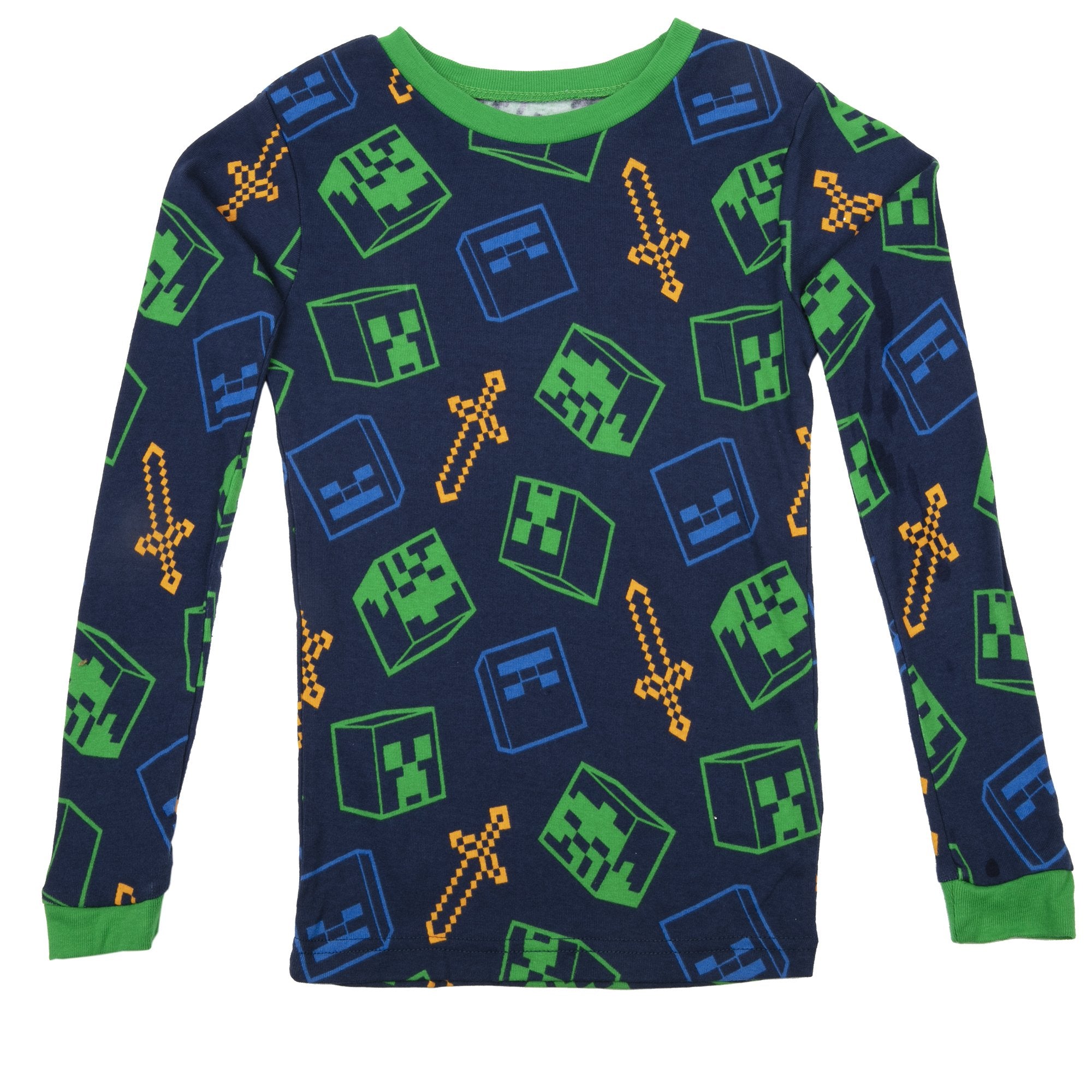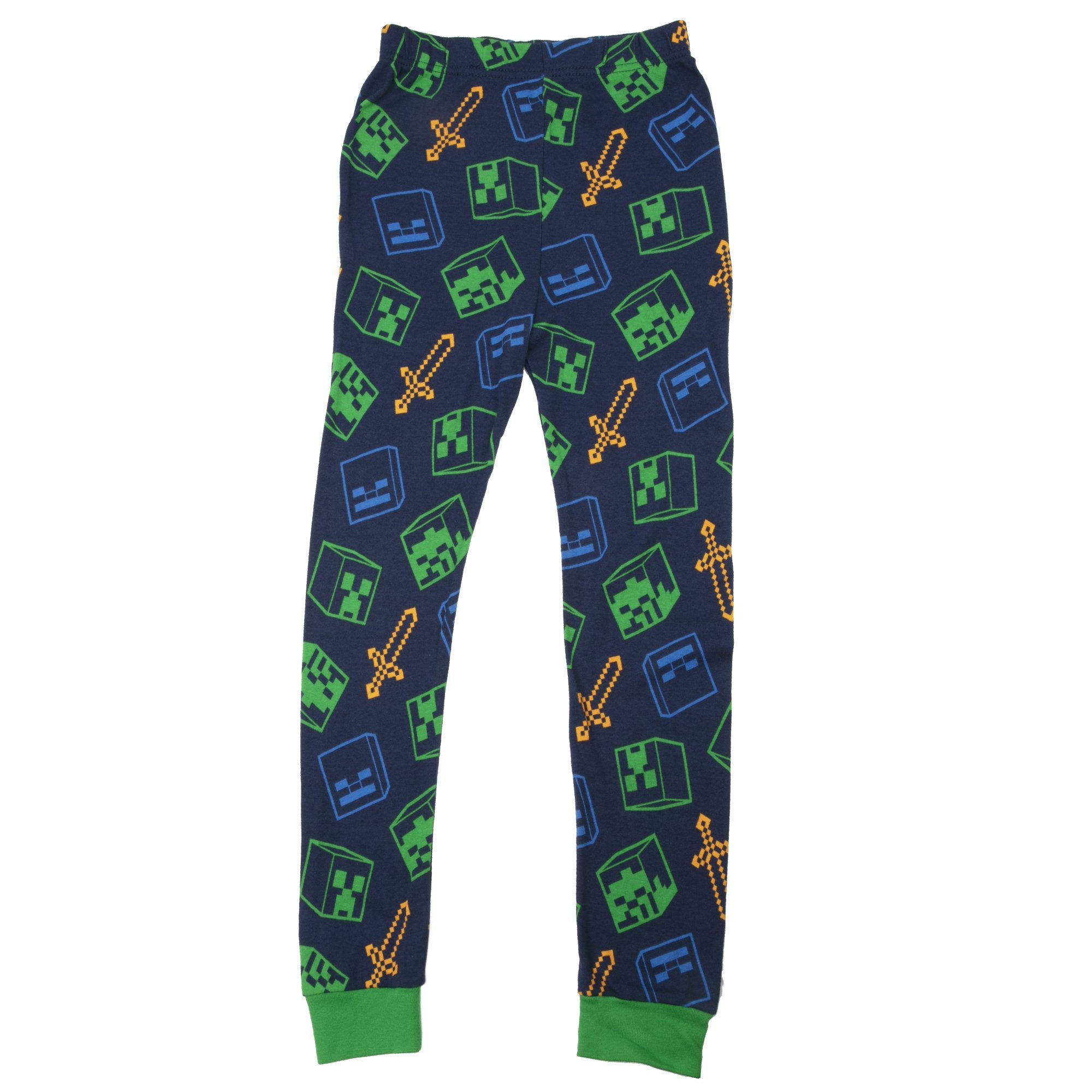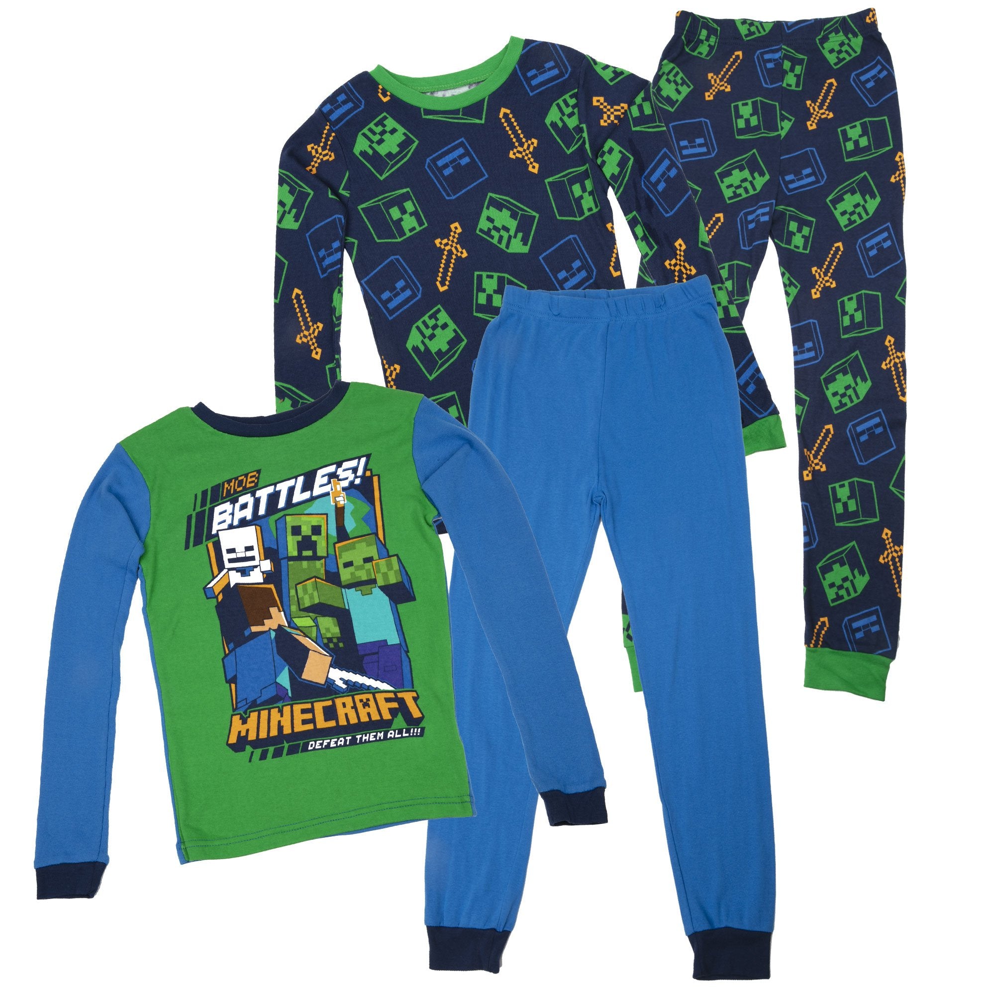 Kids can build a Minecraft world of their dreams with this pajama set. This is a four-piece, two-set pajama pack. One set includes a green and blue top that features Steve battling a Zombie, Creeper and Skeleton, with a matching pair of blue bottoms. The second set includes a navy top and bottom with a repeating pattern of a Zombie, Creeper and Skeleton heads along with Steve's golden swords. Easy to mix and match!