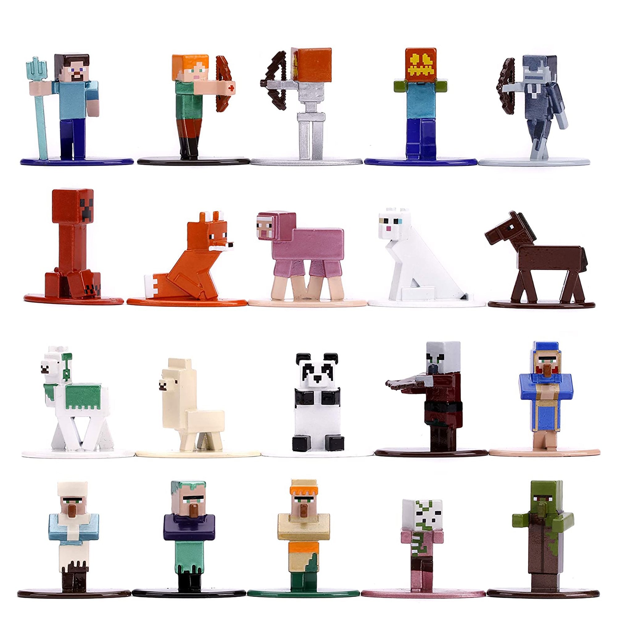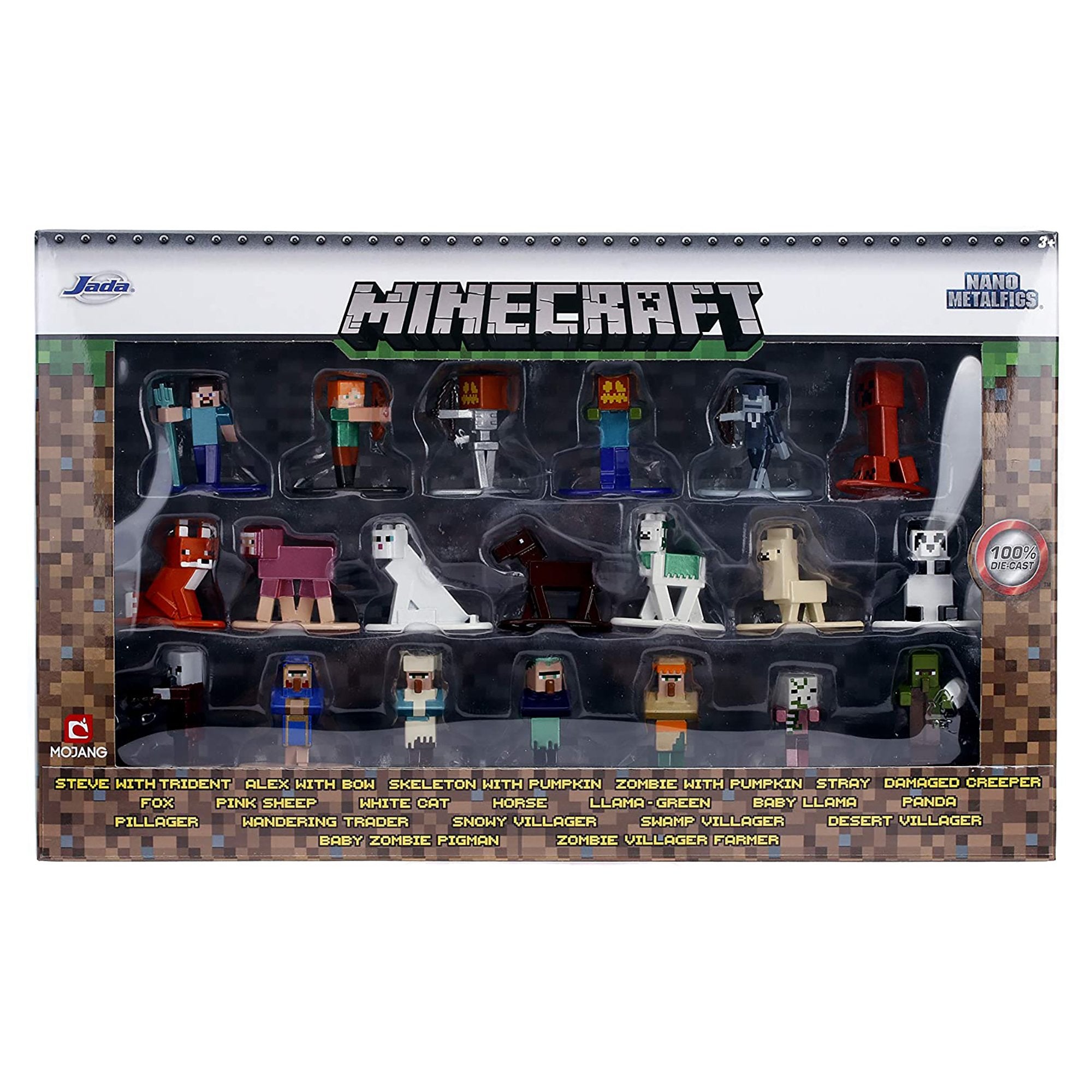 Nano Metalfigs are sturdy die-cast metal figures that feature authentic character likeness. This mega pack includes 20 1.65 inch tall Minecraft game characters on their own stand. Characters include Steve with Trident, Alex with Bow, Skeleton with Pumpkin, Zombie with Pumpkin, Stray, Damaged Creeper, Fox, Pink Sheep, White Cat, Horse, Llama (with Green Carpet), Baby Llama, Panda, Pillager, Wandering Trader, Snowy Villager, Swamp Villager, Desert Villager, Baby Zombie Pigman, and Zombie Villager Farmer.