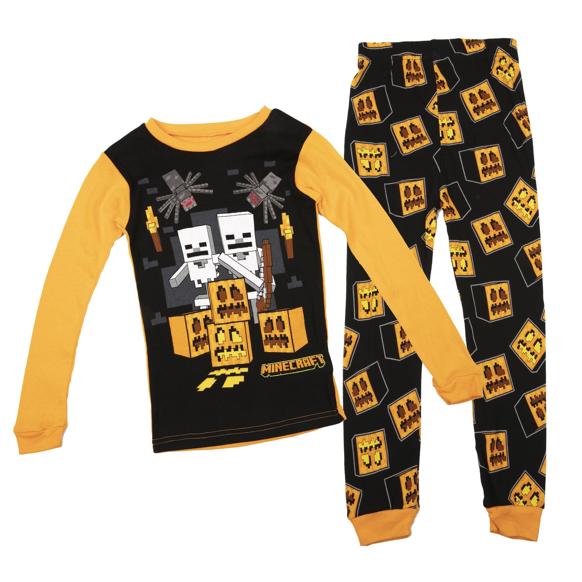 Kids can build a Minecraft world of their dreams with this pajama set. The orange and black top features Skeletons lurking among Jack o'Lanterns. The matching black bottoms are covered with Jack o'Lanterns.