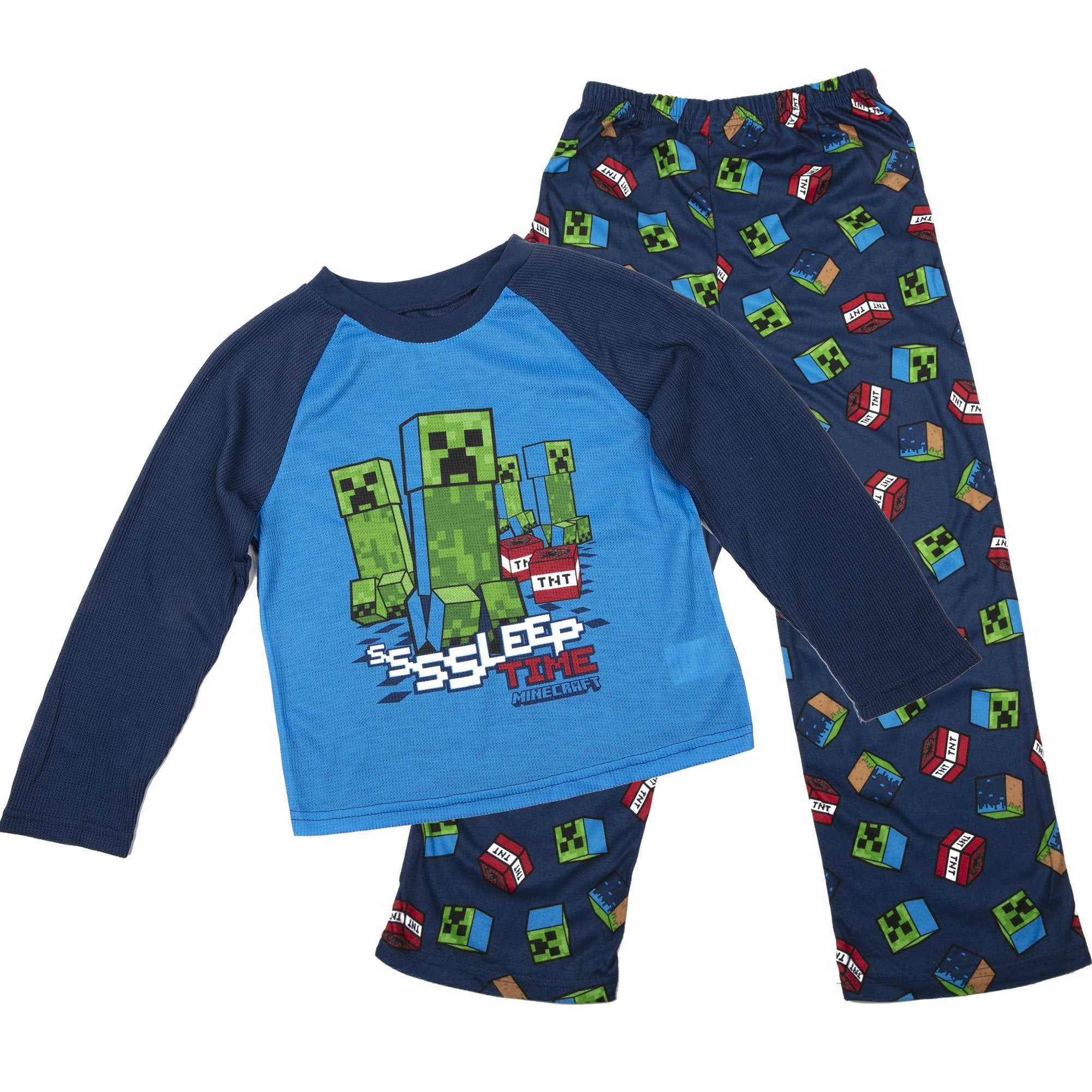 Kids can build a Minecraft world of their dreams with this pajama set. The blue and navy top features Creepers reminding you it's SSssleep time. The matching navy bottoms are covered with Creeper faces, TNT blocks and Grass blocks.