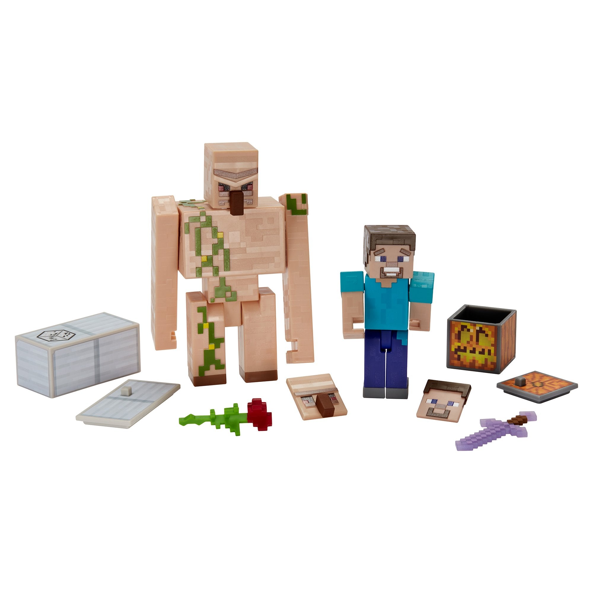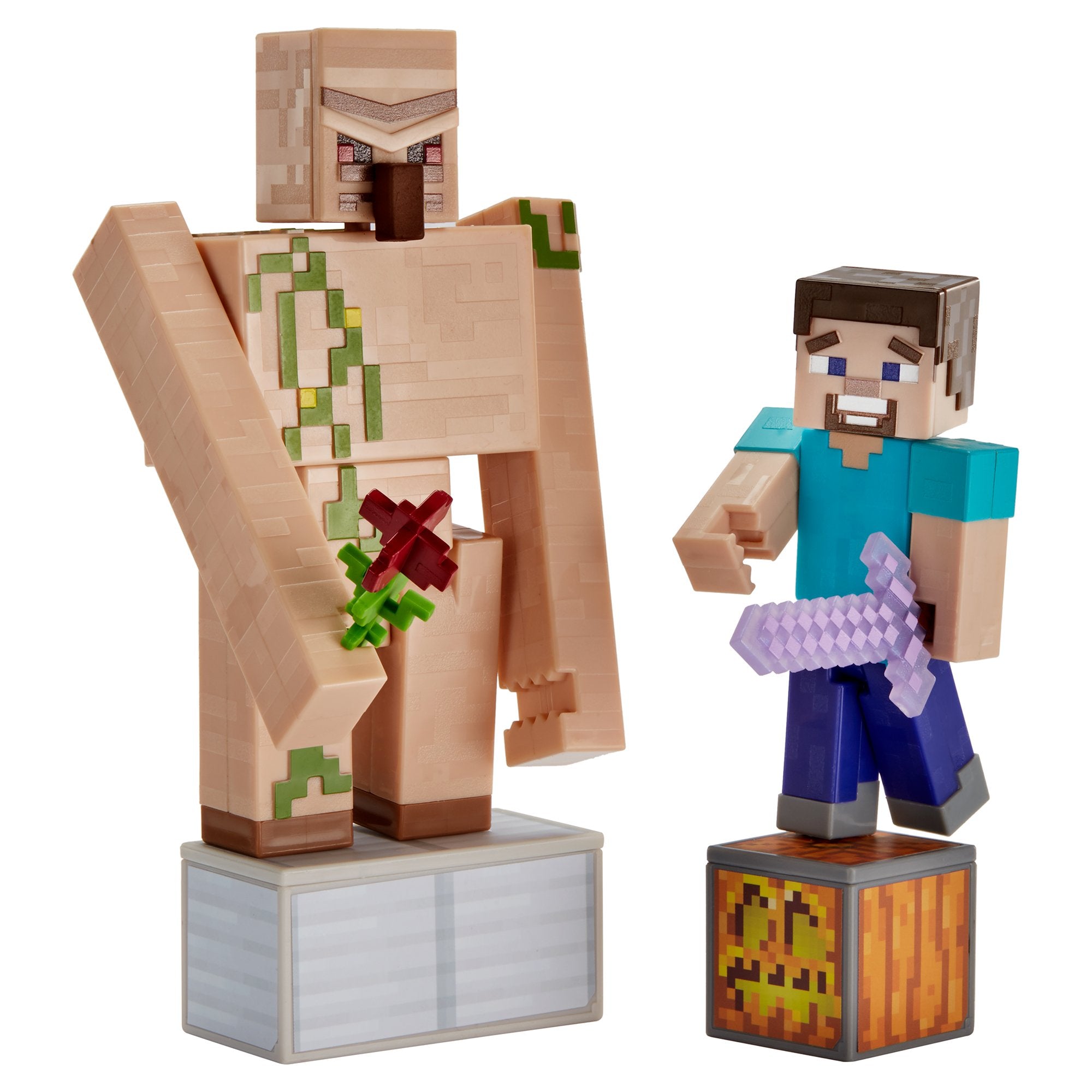 This two-character set includes Steve and his protective Iron Golem. The 3.25-inch Steve figure comes with an Enchanted Sword accessory and a Jack-o-Lantern block that turns into a stand for action posing. The larger Iron Golem comes with a red flower and a double Iron block as its stand. Each character has five points of articulation for expressive storytelling, and the joints "pop" for an even wider range of motion for arms and head. You can change their facial expressions thanks to dimensional, swappable faces.