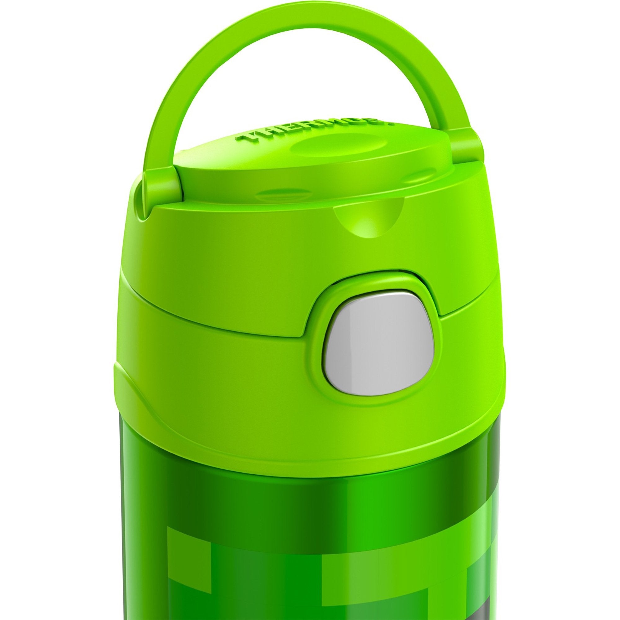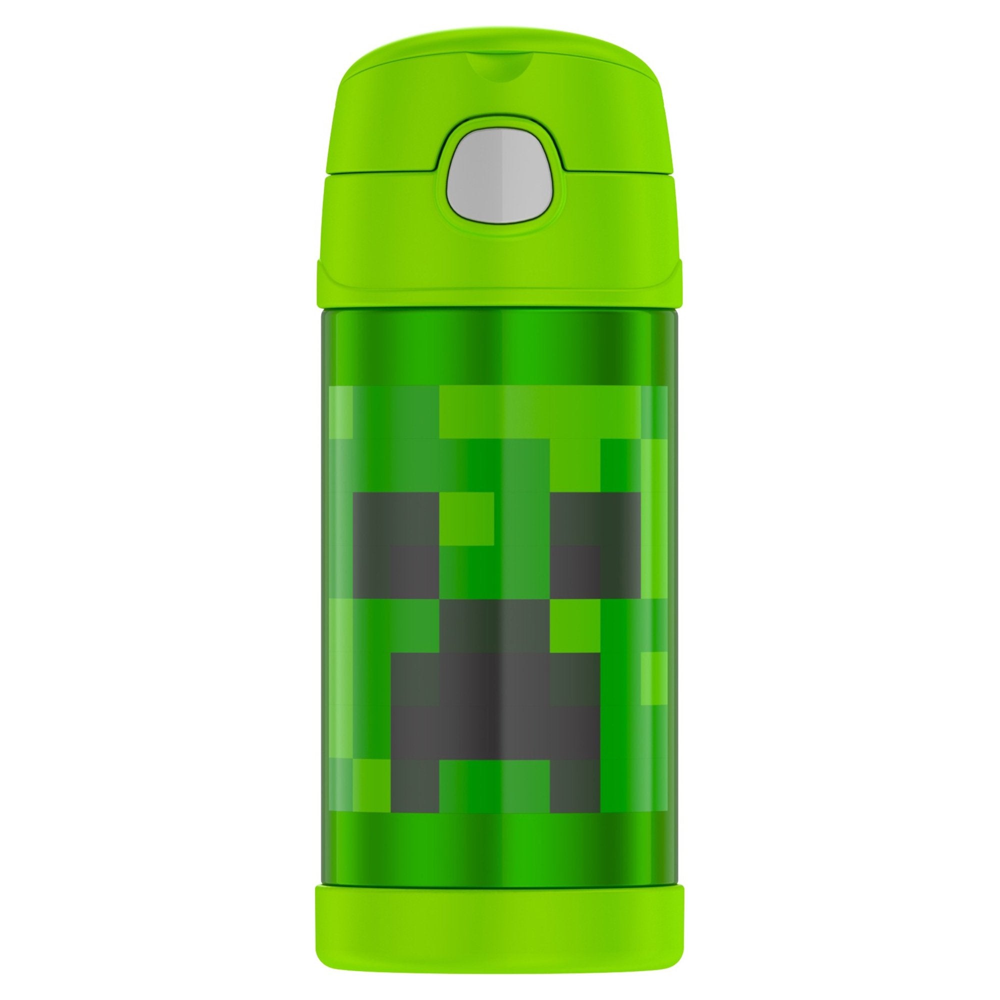 Stay hydrated with Minecraft. The 12-ounce FUNtainer water bottle is a great product to fulfill any on-the-go hydration needs. Constructed with durable stainless steel and Thermos vacuum insulation technology, this bottle keeps beverages cold for up to 12 hours (not for use with hot liquids). It features an integrated carry handle and push button lid with a pop-up straw that is easy to open and comfortable to drink from.